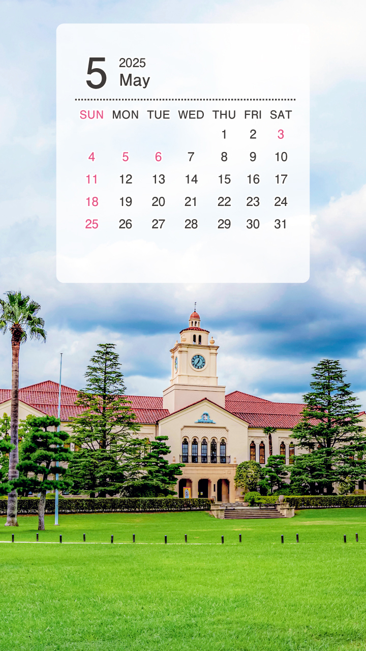 壁紙カレンダー デスクトップを関学のキャンパスで彩りませんか?季節の移ろいとともに多彩な表情を見せる美しい風景を、カレンダーにして毎月アップしています。心癒される母校の姿を、あなたの日常に。 2025年12月カレンダー スマホ用(771KB) ダウンロード PC用(796KB) ダウンロード 2026年1月カレンダー スマホ用(637KB) ダウンロード PC用(918KB) ダウンロード 2026年2月カレンダー スマホ用(539KB) ダウンロード PC用(607KB) ダウンロード 2026年3月カレンダー スマホ用(705KB) ダウンロード 1366×768(714KB) ダウンロード