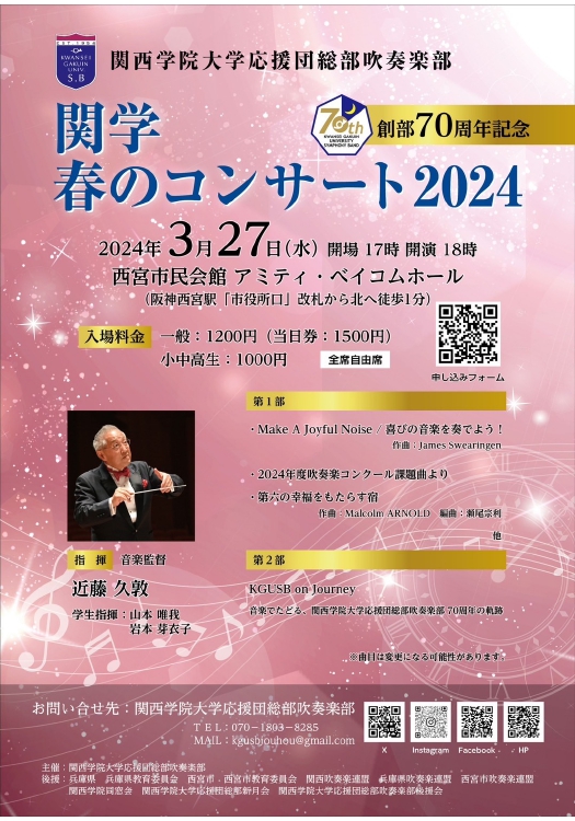 【関西学院大学応援団総部吹奏楽部 創部70周年記念 関学 春のコンサート2024 のお知らせ♪】