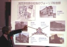 関西学院同窓会会長の大橋様のご挨拶に続いて、創立125周年に向けて行われている学院としての様々な取り組みや現況について、プロジェクターを用いてグルーベル院長先生からご説明がございました。在校生ならびに卒業生が125周年のその日を迎える為、フラッグが掲げられカウントダウンカレンダーが各キャンパスに設置されているそうです。